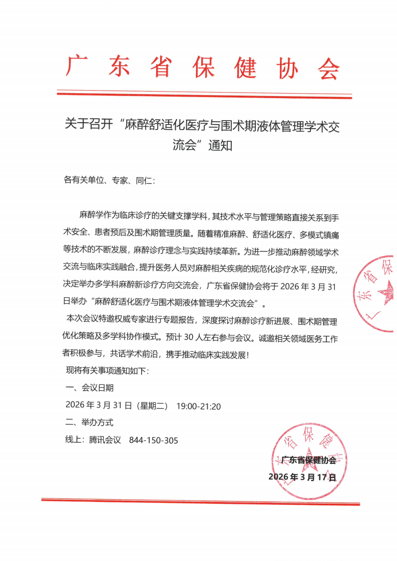 关于召开“麻醉舒适化医疗与围术期液体管理学术交 流会”通知