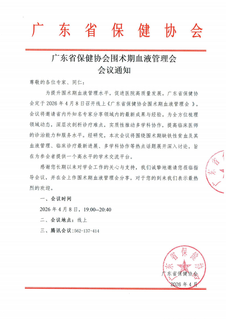 广东省保健协会围术期血液管理会会议通知